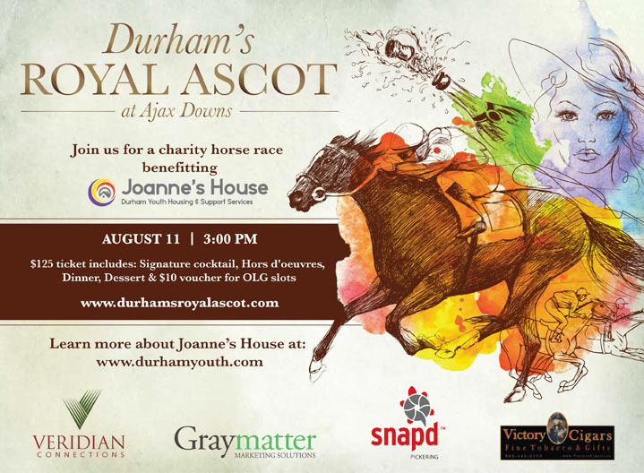 When it comes to fundraising for a good cause, the people at Graymatter Marketing Solutions leave everyone else at the starting gate. Vice president Vanessa Blue had an idea on how to help Joanne’s House, which is a part of Durham youth housing and support services. Memories of her years in England included attending the Royal Ascot, Britain’s most valuable race meeting which attracts many of the world’s finest thoroughbred racehorses. Much like our own Canadian “royal races” like the Queen’s Plate and Prince of Wales, the Royal Ascot is highly anticipated and is also seen as a spectacle of fashion and style on the social scene. An inspired Vanessa approached Durham’s local race track, Ajax Downs. Ontario’s premier Quarter Horse facility. Soon, both the racetrack and the Ontario Lottery and Gaming Corporation (OLG) were on board and Durham’s Royal Ascot was off and running with a twilight feature event scheduled for August 11th, 2016.