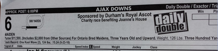 Over $15,000 in sponsorship, gifts in kind and ticket sales was raised this inaugural year. Thanks to the amazing sponsors: Veridian , CB Law, Gervais Rentals, Pattison Outdoor, Snapd Pickering, Move Media, Rockburne Movers, CVH Fashions, Victory Cigars, Arthur Murray Dance Studio, MacAskill Chiropractor, Rotary Club Ajax as well as Ajax Downs, ticket sales and the OLG.