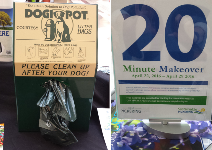 Pickering did their best to bring together all four aspects of sustainability for the day, to encourage the community in fun and inspiring ways to get involved and do their part. The City itself contributes in many ways. You can find “Dogi Pots” provided by the city at many parks in the area. These stations provide biodegradable bags for you to use when stooping and scooping. They are then collected and disposed of in an environmentally responsible manner. On Friday, April 22, 2016, you and your school, community group or neighbourhood association can join forces and participate in the 12th Annual 20-Minute Pickering Makeover. The city will provide the supplies and you supply the elbow grease and at least 20 minutes of your time. You can find more ways to help out by visiting Sustainable Pickering.