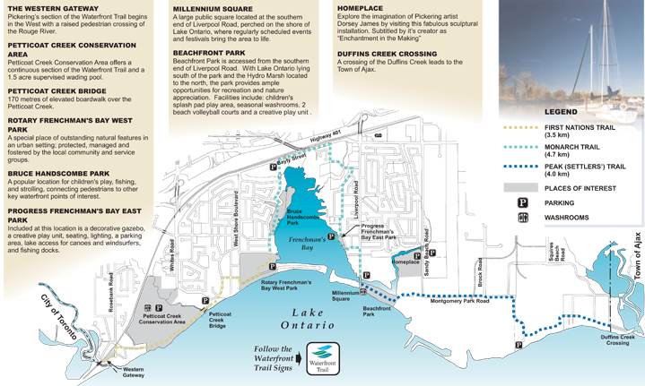 Incredibly, only a few blocks from Canada’s busiest highway and the first Go Train stop in the Durham Region there is a place that can make all that disappear. The only traffic you will find is people out for a run, walk, bike ride, sail or a swim. Frenchman’s Bay offers a peaceful retreat from the every day business of working for a living. Naturally divided into a west side and east side, you will find Frenchman’s Bay Marina, Frenchman’s Bay Yacht club and Pickering Rouge Canoe Club on the shoreline.